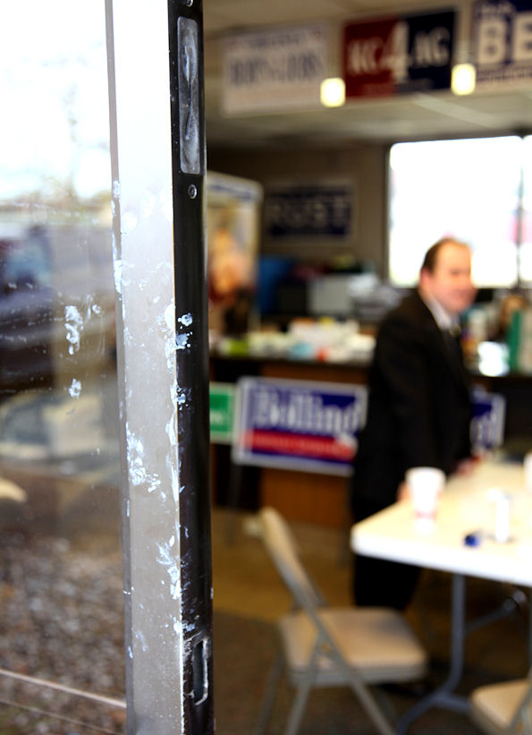 According to the Albemarle County Republican Chairman Chris Schoenewald: When we got to Republican Headquarters at 5 a.m., the front door and the side door had been epoxied shut. We had to break into our own offices this morning. Luckily the damage on the side door was not as bad and we were able to get inside. We reported it to the police (report #2009-1010 [11/3/09]). ![]() Door of Albemarle Republican HQ showing remnants of epoxy, with Chair Schoenewald inside