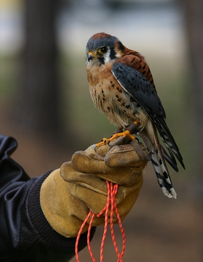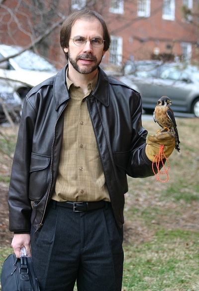![]() As a falconer, it's not uncommon for me to get requests to help out with birds of prey. For instance, last semester I was contacted by teachers at Western Albemarle High School to capture a Cooper's Hawk that had accidentally entered their gymnasium through an open door and couldn't get out. ![]() Over the holiday break, I was given the opportunity to help a kestrel with a broken wing recover. The little falcon was observed on some farmland near Culpepper--he appeared very tame, but in actuality was injured and avoided flying. I trapped the kestrel (as a master falconer, I have the license and permit to legally capture birds of prey). X-rays at the vet indicated that he had fractured the radius in his right wing. We put the wing in a splint for two weeks (bird bones heal much quicker than people bones). I am now working with the kestrel everyday to strengthen the muscles that have atrophied during his period of inactivity, and improve the mobility in the wing. My hope is that he will recover the ability to fly normally. If he does, I'll eventually release him when the weather warms up this spring. If he doesn't, I'll continue to tame and train him so that he can be used as an education bird at a wildlife center. - Randy Bell (electronic mail, January 23, 2006)