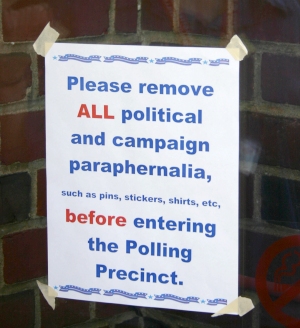 | On November 1, 2004, I received a note from Cindy Janechild asking about wearing political paraphernalia in polling precincts. Emails to Joshua Scott at the University of Virginia's Center for Politics and to Josh Wheeler at the Thomas Jefferson Center for Free Expression confirmed that it is unlawful in Virginia for any person to exhibit any campaign material within 40 feet of any entrance of any polling place. On election day, Charlottesville Registrar Sheri Iachetta confirmed that, according to Clay Landa at the State Board of Elections, Virginia law prohibits wearing political pins, stickers, shirts, etc within the polling precinct. And, in fact, for the first time, signs were posted outside of the polling precincts so that workers inside the polling place would not have to request the removal of an offending item.  Says, Charlottesville Electoral Board member Joan Schatzman, "Virginia law curtails our right to wear a campaign button in the polls but our right to openly wear a side arm is well protected." In the meantime, Joshua Scott (electronic mail, November 1, 2004) offered the example of "one of the more notable situations this year is the voters in Arlington, TX cannot wear Dallas Cowboys gear to the polls, because there is a referendum on the ballot about public financing of a stadium." However, prohibition of political paraphernalia does not appear to be the practice in all Virginia localities. Jeanie Rausse, who voted the same day at Monticello High School in Albemarle County, Virginia said that people were allowed to wear political buttons and T-shirts at the Monticello precinct - a matter Albemarle Registrar Jackie Harris later confirmed, saying that her Electoral Board considered this a matter of free speech.  Mike Seay, a member of Fluvanna County's Electoral Board, says they know the statute bans the display of campaign badges or buttons. "But to tell the truth, [enforcing] that is pretty low on the list of priorities on election day." "Remember, the election Board is in charge of what goes on up until the polls open, but then the precinct chief is in charge. This is because the Board is political in nature, and the precinct workers are supposed to be completely neutral." (Phone conversation with Mike Seay by Dave Sagarin, November 5, 2004). In a later email (November 5, 2004), Josh Wheeler remarks, "Taken literally, the language of the Virginia statute encompasses the wearing of campaign materials by voters. It is therefore understandable that most election boards interpret the statute as preventing voters from wearing campaign materials within the polling place" but adds, "The right to vote is perhaps the most important form of free speech. While many choose not to publicly state their political choices as they exercise that right, others feel strongly about the symbolic importance of expressing their political views at the moments they walk in and out of the voting booth. Unless the government can demonstrate that such expression has a deleterious effect on the electoral process, it should not be in the business of telling people what they can wear as they vote." George Loper, November 5, 2004 Note: See also Comments