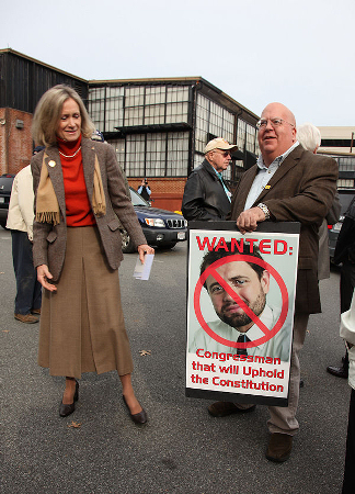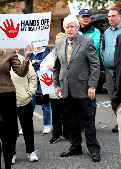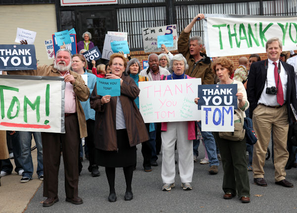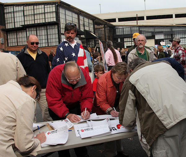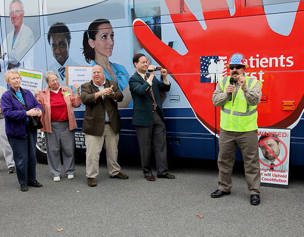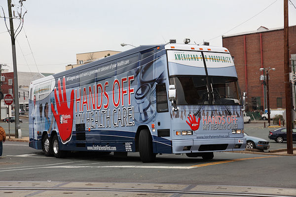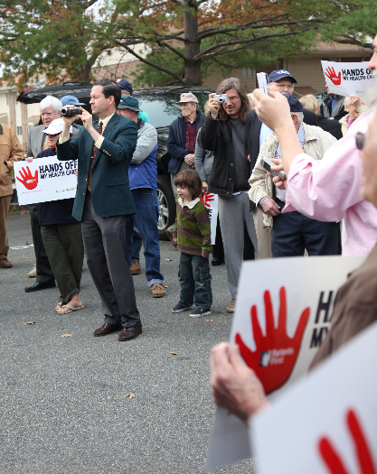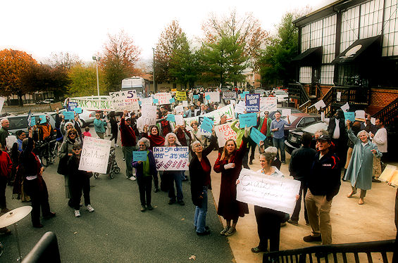 | The "Americans for Prosperity" tour of the Fifth Congressional District rolled into Charlottesville on Tuesday, November 10. Setting up shop in front of their bus, organizers gave speeches and signed up adherents in opposition to Rep. Perriello and the House health care reform bill, passed with his vote last Saturday. Leading the rally was Ben Marchi, Virginia state director for AFP. Among the speakers against reform was Tito Munoz, who gained a place in Sarah Palin's Vice-Presidential campaign as 'Tito the Builder,' paralleling 'Joe the Plumber.' The bus visited Martinsville, Danville and Farmville on Monday. A group of local supporters of Rep. Perriello and healthcare reform were present as well. Michael Snook and his father, Lloyd only learned Sunday of the planned rally, and sent emails to their personal lists, requesting turnout by supporters of the Congressman and of his vote on the measure. Roughly 200 people milled about, with the numbers for each side difficult to determine. (Dave Sagarin, November 11, 2009)