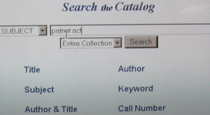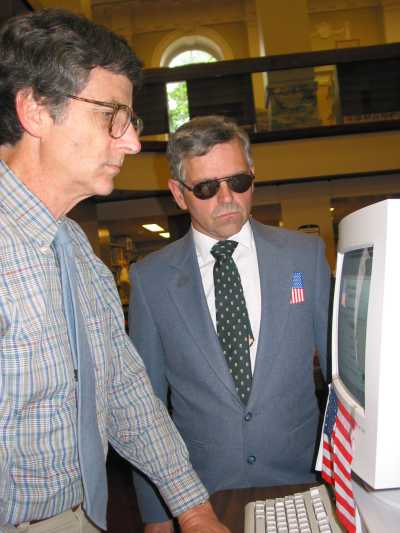 Jim Barns and Bill Davis Present a Dramatic Tableau of the Patriot Act ![]() Librarian Jim Barns looks for information under the helpful eyes of a government "friend" of the library Bill Davis. ![]() ![]() How can you tell when the FBI has been in your library? You can't. The Patriot Act makes it illegal to tell you whether library computers are being monitored. ![]() Does this make you feel more secure? Note: Taking care of our flag is like taking care of our country. What is important to you? Is there a statement you would like to make? A cause you would like to advocate for? If you would like to be immortalized on my website showing your colors, contact me at george@loper.org For articles on this web site regarding the Patriot Act, see Anti-Patriot Act Resolutions,
