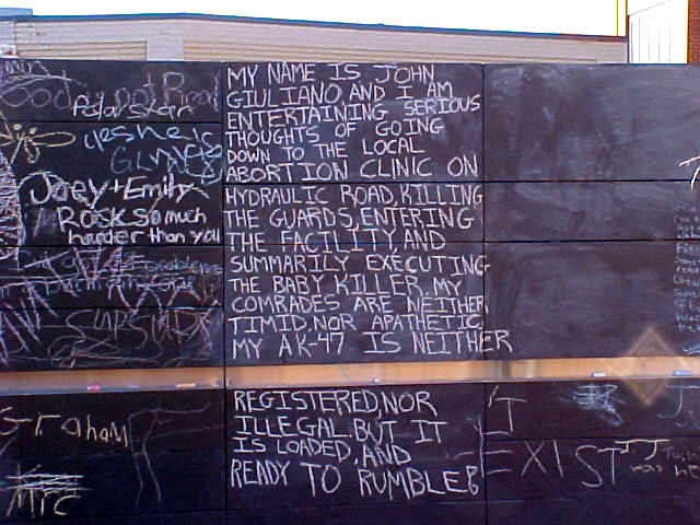 "Think you can write anything you want on the Free Speech monument? Think again.When John Giuliano went to the slate wall at the east end of the Downtown Mall on December 27, he says he intended only to exercise his First Amendment rights. But as he walked away from his chalked message, he got a painful surprise: he was taken into custody by Charlottesville police. "They walked up to me on the corner of East Market and Fourth Street and asked me to talk to them," says Giuliano. "I told them I didn't want to talk to them, and I had nothing to say to them." That response didn't fly. After a brief interaction, says Giuliano, the officers handcuffed him and took him to Region 10 for a mental health evaluation. "They perceived my message as a potential death threat," says Giuliano. The episode highlights the critical-- but sometimes murky-- difference between free speech and a threat, and for Giuliano it meant 10 days of lost freedom. The message he wrote, seen in the photo accompanying this story, states his name and that he is "entertaining serious thoughts of going down to the local abortion clinic on Hydraulic Road, killing the guards, entering the facility and summarily executing the babykiller." ![]() The message concludes with information about a potential method for carrying it out: "My AK47 is neither registered nor illegal," he wrote, "but it is loaded and ready to rumble." The 26-year-old Giuliano says he had no intention of actually committing any act and that he has no history of violence. "I don't feel I'm any risk," he says. But his feelings about abortion are powerful. "Moses commands people to put the evil from among us," he says. "I believe that abortion is an evil act because it's the murdering of an innocent child. It was something I felt like expressing. It would have been right to publicly confess it. That's why I wrote it." Police, however, didn't see it that way. "He was detained becase he wrote something that made police fear for people's lives," says Charlottesville Police Sergeant Mike Farruggio. City spokesperson Ric Barrick says police searched Giuliano's home with permission from his mother and "didn't find anything illegal or that would give us reason to worry about his intentions." So where's the line between expressing your thoughts and getting locked up? The answer, say two free speech advocates, is not clear. The Supreme Court has established that threats are not protected under the First Amendment, says Josh Wheeler, associate director of the Thomas Jefferson Center for the Protection of Free Expression. But the high court, he says, "has not done, in my opinion, a terrific job of defining what constitutes a threat." Wheeler says the most recent ruling by the court states that "true threats" are statements in which the speaker "means to communicate a serious expression of an intent to commit an act of unlawful violence to a particular individual or group of individuals." Wheeler says the City attempted to reach him on the day Giuliano was arrested to get his opinion of whether Giuliano's message was protected speech. "The Free Speech wall is simply a monument to the First Amendment," Wheeler says. "It doesn't impart any extra rights beyond what we all have in any situation." Barrick says this is the first such incident at the wall, so the city wanted to be sure it respected Giuliano's civil liberties while protecting those who might be harmed. While courts decide whether certain speech is a "true threat," Wheeler says, "Reading this statement, I could certainly understand how local law enforcement could infer that this constituted a threat." There are fine semantic differences, Wheeler says, between protected speech and a threat. For instance, had Giuliano changed the beginning of his message to read, "I wish someone would go down to the clinic...." and had he not mentioned an AK-47, his message might not have energized the police. John Whitehead, founder of the Rutherford Institute, agrees that Giuliano's message is frightening. "I think that would constitute a true threat," says Whitehead, noting that abortion clinics have been bombed and doctors shot. "They should see if the guy is serious," says Whitehead. "I think the police did a good job here." While Whitehead agrees with Giuliano's pro-life stance, he says he should exercise his right to free speech by protesting in the traditional manner: with a picket sign that states his views but doesn't threaten. Planned Parenthood of the Blue Ridge president/CEO David Nova declines comment on Giuliano's message, saying only, "This is a security matter." Following his arrest, Giuliano says a Region 10 counselor interviewed him before recommending he be involuntarily committed to a psychiatric hospital in Petersburg. Citing confidentiality laws, Region 10's Buzz Barnett would not comment on the situation, noting only that involuntary commitment is a rare step reserved for situations when other measures fail. But Giuliano says once doctors believed he wasn't having homicidal thoughts-- 10 days after his arrival-- they released him. Despite his frustration with his experience at the wall, Giuliano says he won't hesitate to visit it again. "I'll reiterate that I'm still having those thoughts in a different
