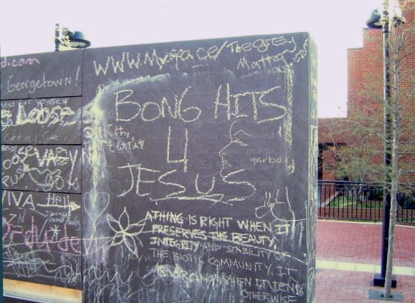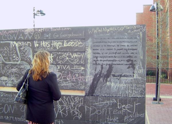 George, This afternoon I stopped at the chalkboard and cleaned off the Marshall quote and the First Amendment. ![]() The Marshall quote was illegible because someone had written, "Bong Hits for Jesus" across it. Given the current Supreme Court case it gave me pause but I still went ahead and removed the quote. The person who wrote it is free to write it elsewhere on the chalkboard, they can walk up and down the Mall and carry a sign reading "Bong Hits for Jesus" and they can stand in front of City Council and proclaim "Bong Hits for Jesus". My removal of their "expression" didn't keep them from expressing themselves. I want to read the quote and I want others to read it so off came "Bong Hits for Jesus". After I finished cleaning the Marshall quote I was busy talking to some curious onlookers (plenty of those, and most are sympathetic or in complete agreement with me and my agenda) and then I saw a woman walk by and pause and look at, and begin to read the Marshall quote. I said to her, "Excuse me, but can I take your picture reading that?" She was a little taken aback and asked me why. I told her that I had just cleaned it and that before that she wouldn't have been able to read it and so I was very happy that she had stopped and I wanted a picture. She thanked me for cleaning it and agreed and I took her picture. It made me feel very good to have made that quote legible and then to have a tourist stop and read it. She told me she was visiting from Smithfield. ![]() Do you realize that both engravings are more often illegible than they